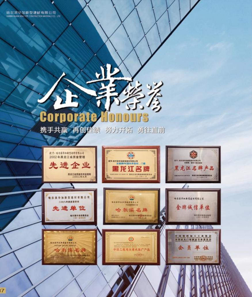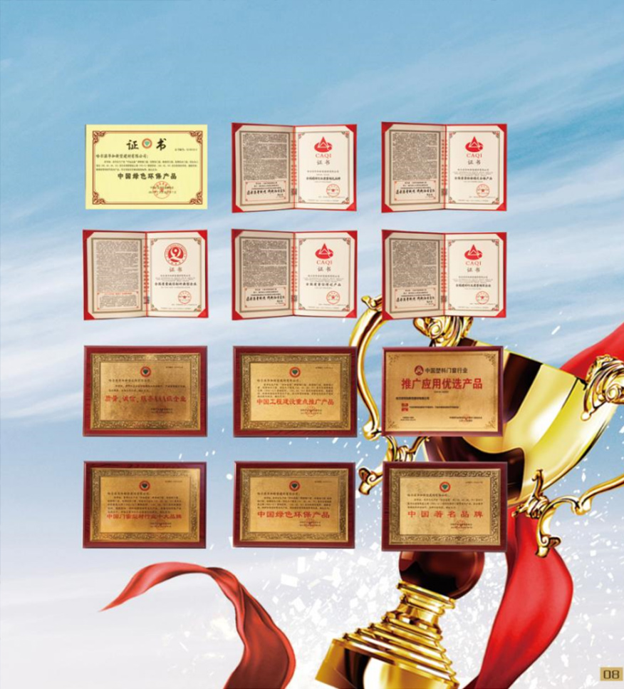 相繼獲得“中國著7名品牌”“窗型材行業十大品牌”“質量、誠信、服務AAA級企業”“黑龍江名牌”“金牌誠信單位”“先進高科技企業”“黑龍江省免檢産品”“黑龍江名牌産品”“哈爾濱名牌産品”等上百項榮譽稱号,被中國建築金屬結構協會塑料門窗委員會授爲定點企業、理事單位。